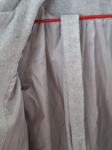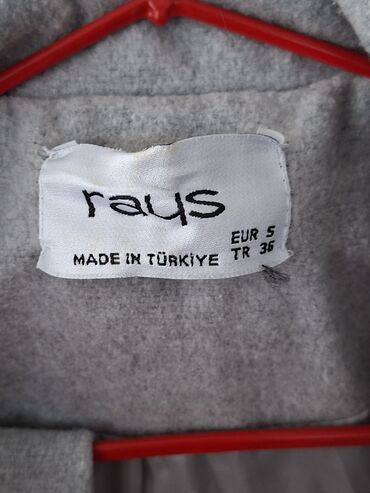 Rays qadın palto – Türkiyədə istehsal - Rəng: açıq boz - Ölçü: EUR XL (TR 42) – etiket üzərində - Model: klassik dizayn, enli haşiyəli/yaxa (revers), dizə yaxın uzunluq - Bağlanma: kəmərli (yanlard...