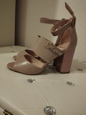 Bej rəngli qadın sandalı - Model: açıq burunlu, kvadrat uclu - Rəng: açıq bej/nude - Material: parlaq süni dəri (üst), rahat içlik - Daban: hündür, qalın blok daban – stabil və rahat - Bağlama: to...