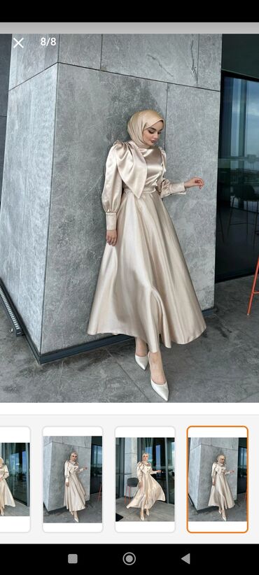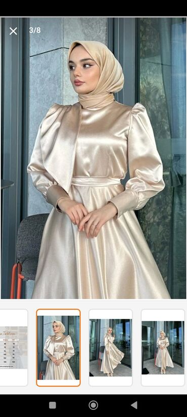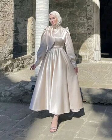 Zərif atlas parçasından hazırlanmış, incə parıltılı, bej-qızılı tonlarda ziyafət/nişan üçün uyğun hicablı don.