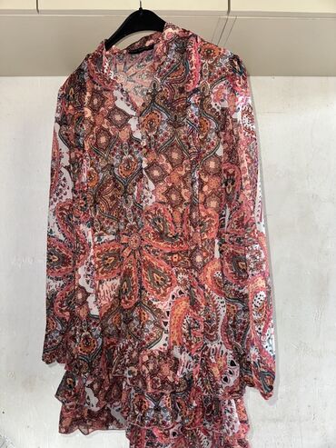Qadın paltarı – leopard naxışlı, qırmızı/çəhrayı fon üzərində qara print. - Model: V-yaxa, uzun qol, bel hissəsi rezinli, ön hissədə kiçik düymələr - Etek hissəsi: qat-qat, mini/qraduallı kəsim - P...