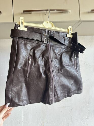 Qəhvəyi rəngdə süni dəri ətək. A-şikildə kəsim, qısa model. Ön hissədə