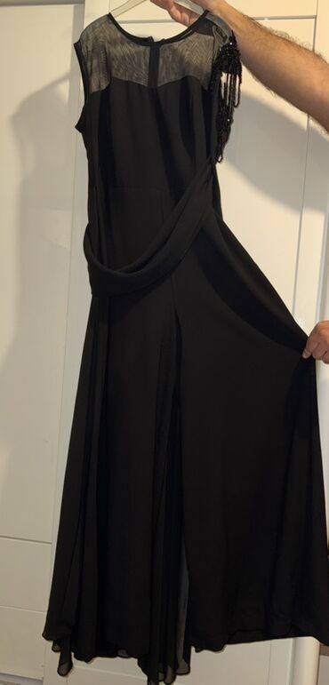 Zərif ziyafət geyimləri dəsti - Qara rəngdə uzun ziyafət donu: sinə və çiyin hissəsində şəffaf tül detalları, sağ çiyində boncuklu püskül bəzəyi, beldən asimmetrik drapeli kəmər effekti. Axıcı, qa...