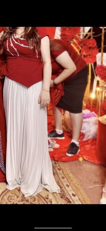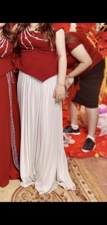 - Alt hissə: ağ/krem rəngli, axıcı materialdan hazırlanmış, uzun və plisəli ətək. Yerişdə gözəl dalğalanır, mərasim və tədbirlər üçün ideal görünüş yaradır.