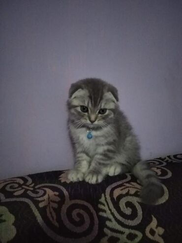 Scottish Fold balası - Cins: Scottish Fold (qatlanmış qulaqlar) - Rəng: gümüşi tabby – tünd zolaqlar və ləkələr, ağ qarın - Gözlər: böyük, dairəvi, mavi-boz tonlarda - Tük tipi: qısa və yumşaq - X...