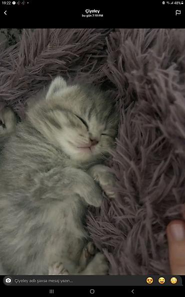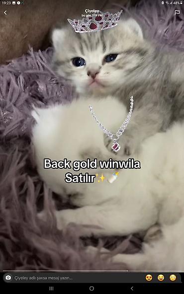 Təmiz saf qan dişi balalar - Cins: Ana – sallaqqulaq Şotland (Scottish Fold), Ata – dikqulaq British - Cinsiyyət: Dişi balalar - Rəng: Bütöv boz (blue), eyni zərif tonlarda - Xüsusiyyətlər: Yumşaq...