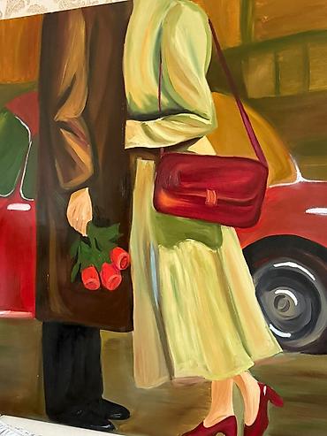Təsvir: Kompozisiyada qırmızı avtomobil fonunda iki insanın görüş anı təsvir olunub.