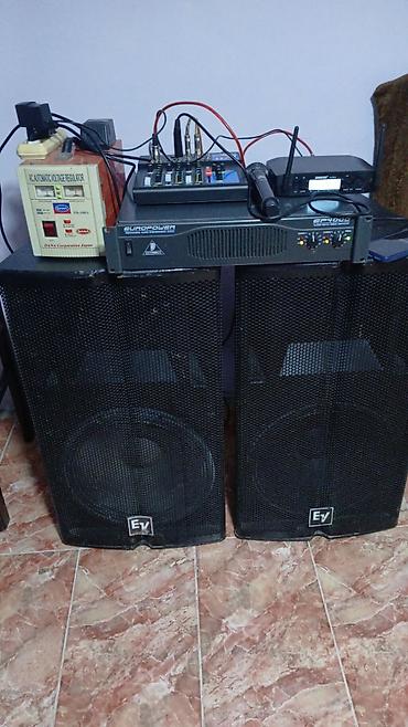 - EV (Electro‑Voice) pasiv akustik səs kolonları – 2 ədəd, metal ızgaralı korpus, güclü bas və aydın orta-yuxarı tezliklər üçün 15" wooferli iki yollu quruluş.