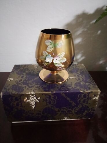 - Dekorativ qızılı tonlarda bəzəkli qədəh/qrafin stili qab. Gövdəsində əl işi çiçək motivləri, parlaq metalik görünüş, enli kasa və dayaqlı altlıq.