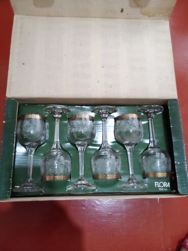 - 6 ədəd şüşə badə qədəhi (FLORA, 150 ml). Şəffaf şüşə, mat naxışlı ornament və üst hissədə qızılı haşiyə. Hündür ayaqlı klassik forma, içkilər üçün uyğundur.