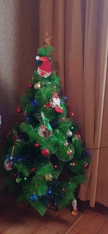 - Müxtəlif bəzəklər: qızılı, gümüşü və qırmızı şarlar, tematik fiqurlar (Şaxta baba, oyuncaq fiqurlar), dekorativ lent və bəzək asılqanları