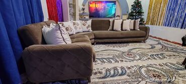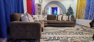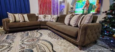 Rahat divan - L formalı, geniş və funksional dizayn - Tünd yaşıl məxməri oturacaq/yastıq örtükləri, qəhvəyi (eko) dərili karkas və qol dayaqları - 3 iri oturacaq yastığı və 3 arxa yastığı daxil - ...