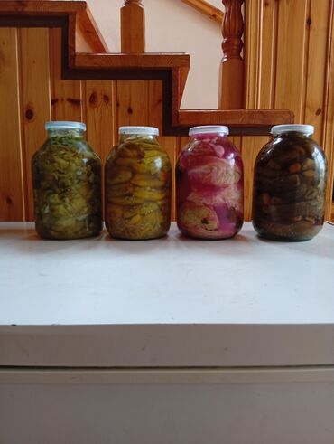 - Şüşə bankalarda müxtəlif turşu və marinadlar. Şəkillərdə kələmlə hazırlanan qarışıq turşu, xiyar və digər tərəvəzlərin marinadı görünür. Bankalar möhkəm qapaqlıdır, iri həcmlidir (təxminən 3 litrlik). Rəngli şirəsində hazırlanmış kələm turşusu da mövcuddur.