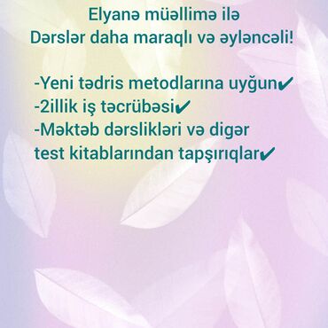 Elyanə müəllimə ilə ibtidai sinif və məktəbəqədər hazırlıq dərsləri - İbtidai sinif üzrə 2 fənn: 15 AZN - Azərbaycan dili və riyaziyyat: 15 AZN - Məktəbəqədər hazırlıq dərsləri: 20 AZN - Dərslər h...