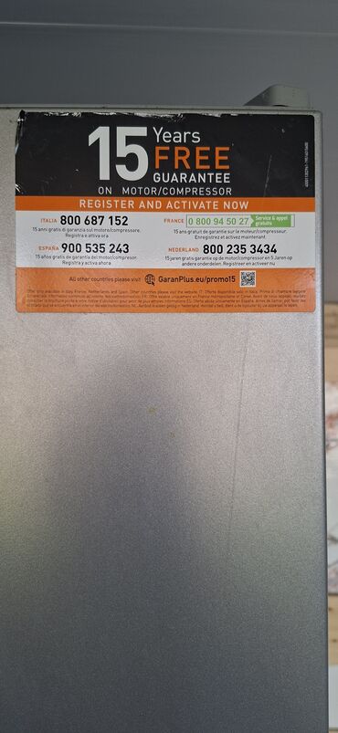 - Mühərrik/kompressor üçün 15 il pulsuz zəmanət qeyd etiketində göstərilib (qeydiyyat və aktivləşdirmə tələb olunur; etiketdə GaranPlus.eu/promo15 linki var)