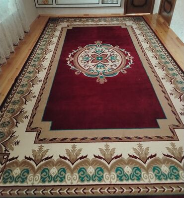 Xalça – uzunluq 2.95eni 2✅ - Rəng: tünd bordo fon, krem və bej haşiyələr, qara və qızılı tonlarda işləmələr - Dizayn: mərkəzdə medalyon, ətrafında floral və arabesk ornamentlər, geniş dekorativ ha...
