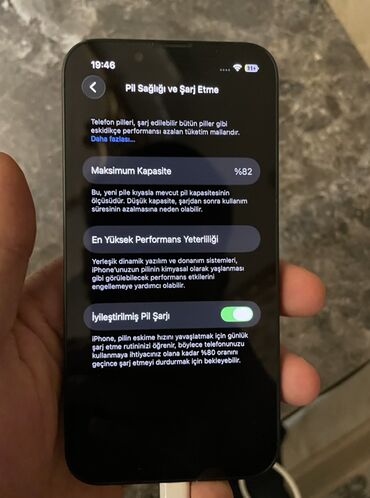 - Batareya: “Battery Health” maksimum tutum 82% (şəkildə göstərilir); Optimallaşdırılmış Şarj funksiyası aktiv