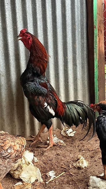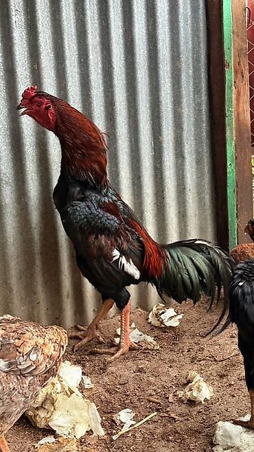 Məhsul: Gənc döyüş tipli xoruz (Aseel/oxşar xətt) Xüsusiyyətlər: - Yaş: təxminən gənc yaş (tam yetkinliyə yaxın) - Rəng: qırmızı-qəhvəyi lələklər, qanadlarda tünd-yaşıl parıltı, quyruqda qara tonl...