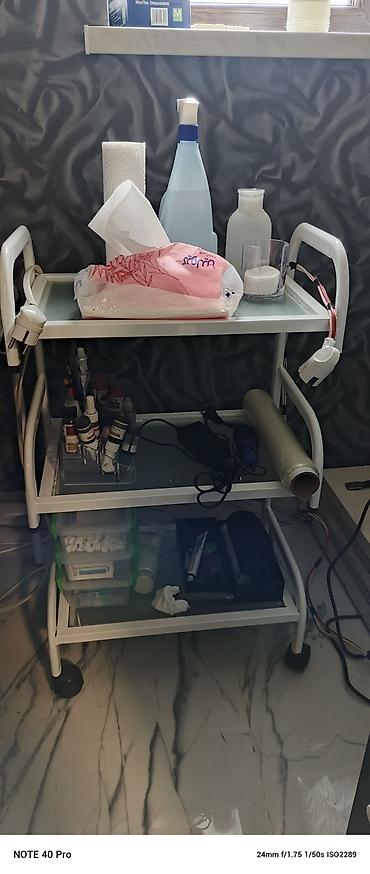 - Kosmetoloji servis rəfi: 3 mərtəbəli, təkərli. Üstündə/depolamada dezinfeksiyaedici butulkalar, salfet/peçetlik, sarğı plyonkası, müxtəlif kosmetoloji serum və materialları üçün bölmələr, elektrik qoşulmaları üçün yan tərəf tutacaqları nəzərdə tutulub.