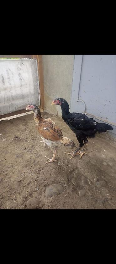 Salfəli rəngli (qara-ağ-boz naxışlı) iki ədəd xoruz. - Cins: yerli döyüşkən-tovuq qarışıq tip (yüngül bədənli, hündür ayaqlı). - Yaş: yetkin. - Xarakteristika: güclü dimdik və daraq, canlı və çevik...