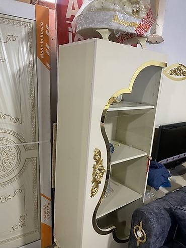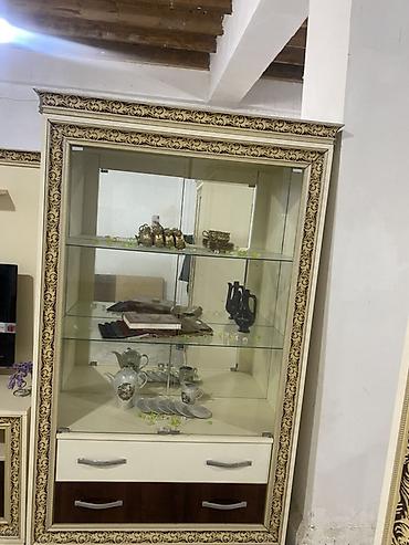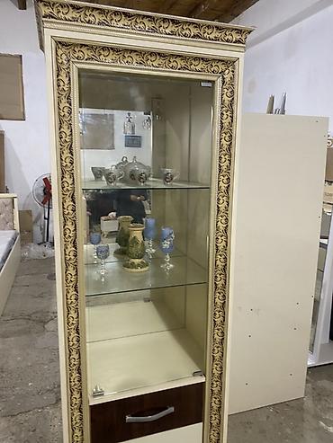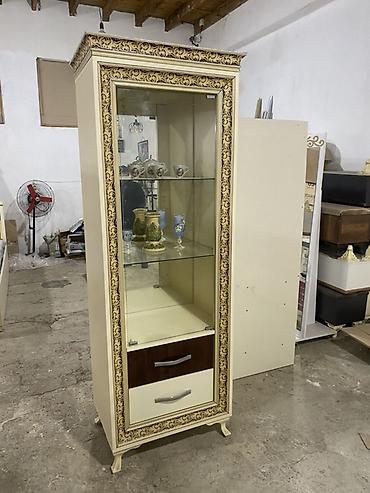 - Vitrin şkafı: Şüşə qapılı, içəridə iki şüşə rəf, alt hissədə 2 çekmece. Krem rəng və qızılı naxışlı çərçivə, dekorativ ayaqlar.