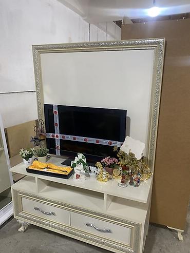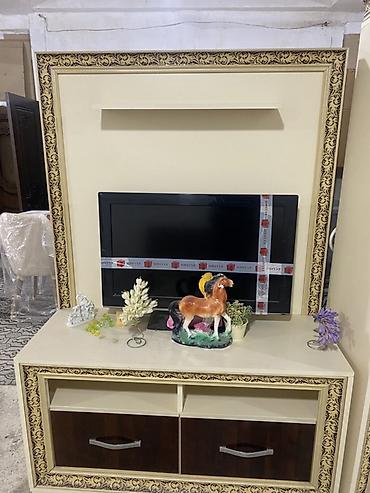- Alternativ TV stendi: İşıq krem rəngli panel, gümüşü ornamentli çərçivə, üstdə açıq rəflər, aşağıda iri həcmli 2 çekmece. Stabil dekorativ ayaqlar.