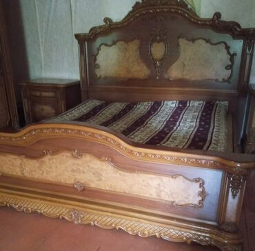 - İki nəfərlik çarpayı: yüksək başlıq, relyef oymalar, dekorativ panellər; ön bortda geniş dekor xətti.