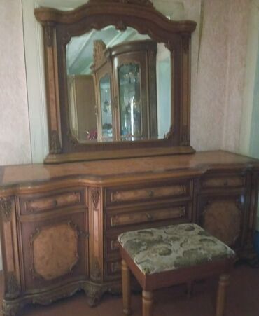 - Konsol/komod güzgü ilə: üstü dalğalı formadır, ortada bir neçə çekmece, yanlarda qapalı bölmələr; iri dekorativ çərçivəli güzgü və üzərində oturmaq üçün yumşaq oturacaqlı taburet.