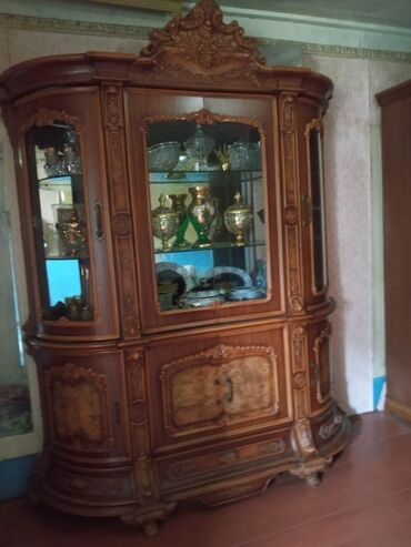 - Göstərmə vitrini: şüşə qapılar, içəridə şüşə rəflər, yanlarda şüşəli bölmələr, aşağıda əlavə qapalı saxlama; üst hissədə dekorativ tac.