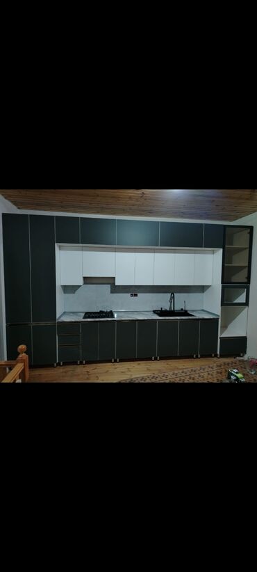 - Mətbəx mebeli: xətti və künc layihələr, yuxarı-aşağı dolablar, qara mərmər effekti işlənmiş stolüstü və panel, qaz sobası üçün ara bölmə, inteqrasiya edilə bilən sobalı modul, dərin və ikigözlü paslanmayan polad lavabo, gizli tutacaqlar, vitrinli künc bölməsi. Müasir iki rəngli dizayn variantları (tünd yaşıl–ağ və s.).
