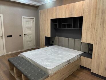 - Yataq otağı komplekti: yumşaq başlıqla inteqrasiya olunmuş iri divar modulu, asma şkaflar və açıq rəflər, yan tumbalar, altı saxlamalı çarpayı bazası, ön oturacaq/puf bölməsi.