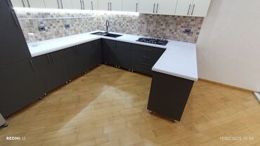 - Materiallar: MDF/LDSP fasadlar, laminat və ya daş görünümlü stolüstülər, yumşaq qapanan menteşə və relslər, metal ayaqlar, qara mat və parlaq örtük alternativləri.