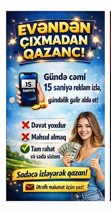 Evdən çıxmadan işləmək istəyənlər üçün onlayn fəaliyyət təklifi. - Evdən işləmə imkanı: azyaşlı uşağı olan və ya evdən kənara çıxa bilməyən şəxslər üçün uyğundur. - Addım-addım öyrədilən sistem: a...