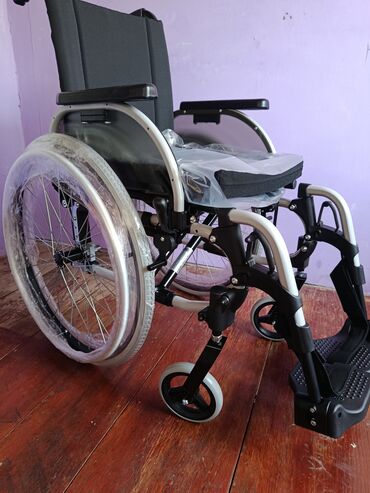 - Təkərlər: böyük arxa təkərlər (əl halqaları ilə özünü idarəetmə imkanı), kiçik ön manevr təkərləri; arxa təkərlərdə əyləc qolları