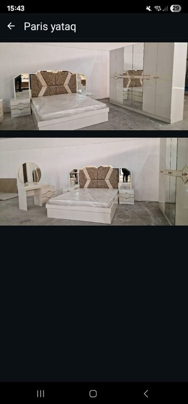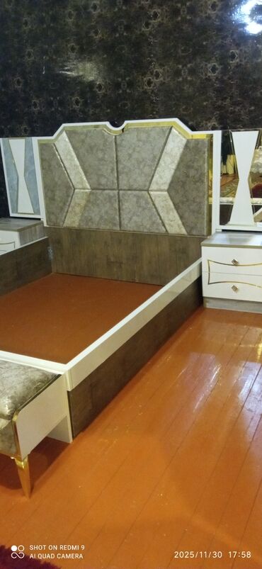 - Yumşaq başlıqlı çift nəfərlik çarpayı (parça/deri teksturalı başlıq, dekorativ panellər)