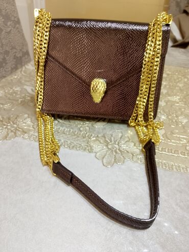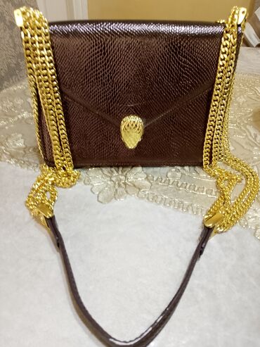 Qadın əl çantası – qəhvəyi/bej tonlarda, ilan dərisi fakturalı ön və arxa hissə ilə. İki möhkəm əl tutacağı və qızılı rəngdə metal bəzəklər. Üst hissə tam uzunluqlu fermuarla bağlanır. Daxili: - S...