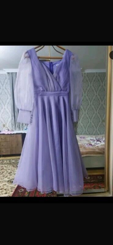 - Rənglər: zümrüd yaşıl və bənövşəyi (lavanda) - Model: A-kesim ətək, laylı və geniş axıcı formaya malik - Yaxa: V-yaxa, qatlansa efektli büst hissə - Qol: Şəffaf şifon, puff-stil uzun qollar; manjetli və dekorativ düyməli - Bel: Yığma bel xətti fiquru vurğulayır - Bağlanma: Arxa hissədə gizli kilid/bağlama - Material: Yüngül və dalğalı şifon, altlıqla - Uzunluq: Baldır ortasına qədər midi - Tətbiq sahəsi: məclis, nişan, məzuniyyət, toy qonağı, bayram və xüsusi günlər üçün uyğundur - Uyğun kombin: klassik topuqlar, zərif çanta və minimal zinət əşyaları ilə asan uyğunlaşır