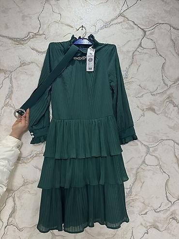 Tünd yaşıl rəngdə, pliseli parçadan hazırlanmış zərif qadın paltarı. Dizdən aşağı uzunluq, uzun qol və yüngül A-kəsim siluet. Üst hissə incə şaquli pliselərlə, ətək isə çoxqatlı frill-lərlə həcmi və hərəkətliliyi artırır. Yuxarıda balaca ruffles-li yaxa və bəzəkli detallı boyun xətti mövcuddur. Qolların ucları düyməli manjetlə tamamlanıb. Komplektə daş-detal ilə bəzədilmiş uyğun kəmər daxildir. Gündəlik geyimdən tutmuş tədbir və bayramlar üçün uyğun, rahat və feminen görünüş yaradır. Rəng və qatlı dizayn bədəni vizual olaraq incəldir, plise parça isə formanı gözəl saxlayır.