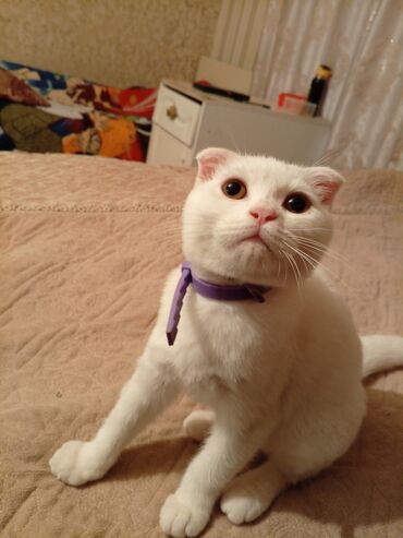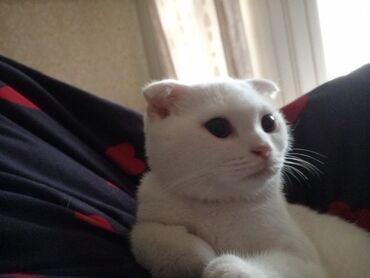 Ağ tüklü, mavi gözlü, 5aylıq qulaqları yığılmış erkek (Scottish Fold) Xüsusiyyətlər: - Rəng: tam ağ, yumşaq və sıx tüklü örtük - Gözlər: parlaq mavi - Qulaqlar: yığılmış/qatlanmış - Xasiyyət: mehr...