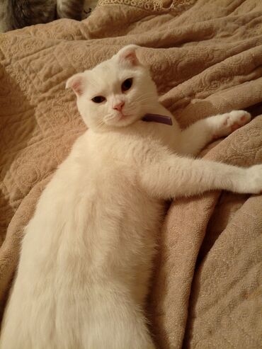 Sahibləndirilir. 1 yaş 20 günlük pişik balası. Anası Anqora, atası Şotland (əyrıqulaq). Yemək yeyir, qum tərbiyəsi var. Xüsusiyyətlər: - Rəng: ağ tüklü, başında tünd ləkəli naxış - Qısa quyruq, yu...