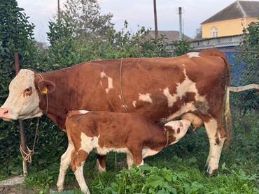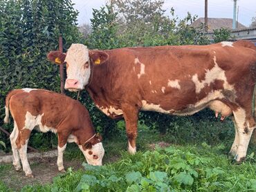 Südlük inək və buzağı birlikdə - Cins: qara-ağ Holşteyn tipli - İnəyin yelinləri iri, dörd məmə tam formadadır; sağım üçün əlverişli quruluş - Yanında eyni günlərdə doğulmuş qara buzaq var - İp və...