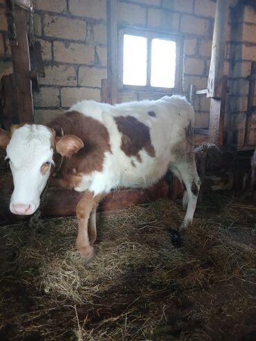 Simental dişi düyə – 1 yaş 8 aylıq. - Cins: Simental (qırmızı-ağ enli ləkəli rəng). - Cinsiyyət: Dişi, düyə. - Yaş: 1 il 8 ay. - Qulaqlı və buynuzlu, sağlam bədən quruluşu, gövdə uzun, döş qəfəsi ...