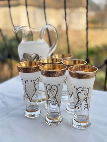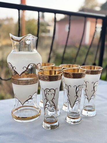 Zərif qızılı naxışlarla bəzədilmiş təmiz çexski xrustal kompotnitsa və stəkan dəsti. Xüsusiyyətlər: - Material: təmiz xrustal - Dekor: 360° qızılı haşiyə və zərif oriental naxışlar; sürahinin boğa...