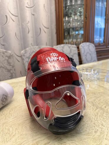 - Qırmızı taekvondo dəbilqəsi – Daedo, şəffaf üz sipəri ilə.