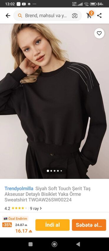 - Trendyolmilla “Siyah Soft Touch Şerit Taş Aksesuar Detaylı Bisiklet Yaka Örmə Sweatshirt TWOAW26SW00224” – qara rəng, yumşaq “soft touch” toxuma, çiyin hissəsində zərif şerit-daş aksesuar detayı, bisiklet yaxa, elastik bel və qollar.