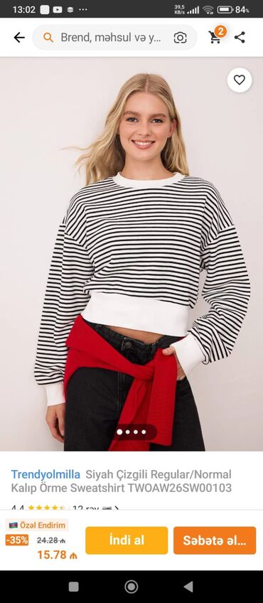 - Trendyolmilla “Siyah Çizgili Regular/Normal Kalıp Örmə Sweatshirt TWOAW26SW00103” – ağ-qara incə zolaqlı naxış, qısa kəsim (cropped) görünüş, bisiklet yaxa, geniş qol forması, elastik ağ manjet və bel.