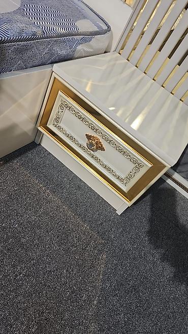 Klassik üslubda yataq otağı dəsti Tərkibi: - Yumşaq başlıqlı iki nəfərlik çarpayı (başlıq kapitone tikişli, dekorativ qızılı detallar) - İki ədəd tumba (üstündə dekor üçün yer, qızılı ayaqlar) - G...