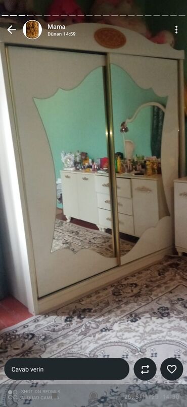 Klassik üslubda yataq otağı mebel dəsti Dəst tərkibi: - 6 qapılı iri qarderob: krem rəngdə, qızılı haşiyələr və qızılı tutacaqlar, 2 ədəd tam ölçülü güzgü qapı, daxili geniş saxlama sahəsi üçün bö...