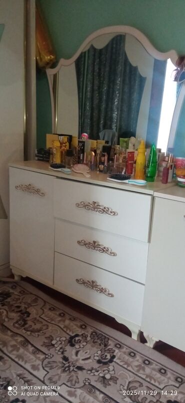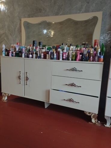 - Tualet masası/komod – böyük güzgü, yanlarda qapılı bölmələr və mərkəzdə üç çekmece. Dekorativ tutacaqlar və naxışlı ayaqlar.
