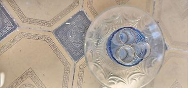Hər biri çox əla vəziyyətdədir. Sadəcə vitrində olub, istifadə olunmayıb. Hamısı birlikdə 55 azn. Qara-bənövşəyi şüşə dəst – dekorativ naxışlı - Material: qalın şüşə - Rəng: mat boz fon üzərində q...
