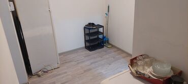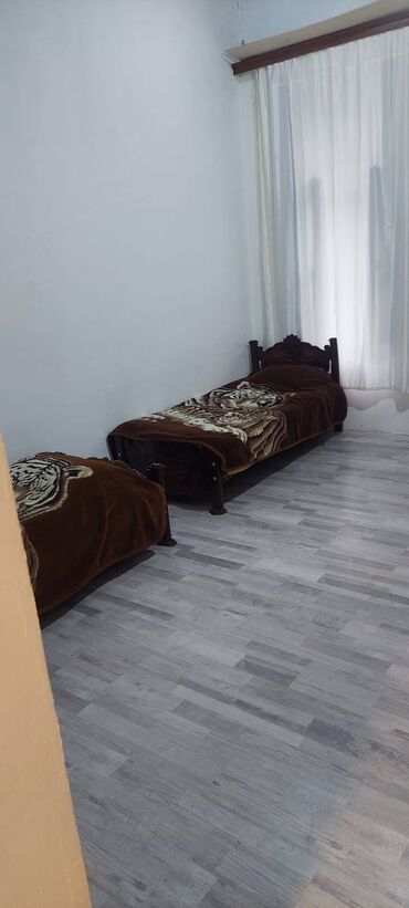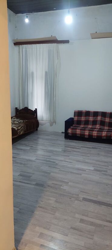 - Geniş, işıqlı zal/otaq: laminat döşəmə, pəncərədə nazik pərdə, tavan işıqları. Otaqda divan və tək nəfərlik çarpayı mövcuddur.